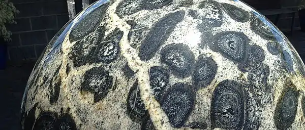 Section of Boogardie orbicular granite used as a Kugel fountain at the W.A. Mines Department core library, Carlisle, Western Australia