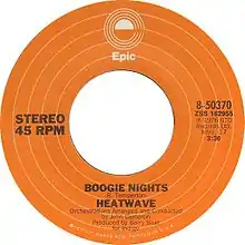 "Boogie Nights" is a 1977 single by international funk-disco group Heatwave. It was written by keyboardist Rod Temperton and was included on Heatwave's debut album, Too Hot to Handle. Harpist Carla Skanger (a pseudonym of Sheila Bromberg of the London Symphony Orchestra) played harp and American actor and singer Clarke Peters performed backing vocals on the recording.[1]