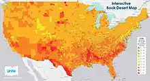 Unite for Literacy has developed a book desert map of the United States powered by Esri's ArcGIS platform, which provides a visual presentation of the lack of books in the nation, states, counties and census tracts.[10] To create the map, Unite for Literacy performed a statistical analyses of data from the National Assessment of Educational Progress and the American Community Survey. Data used in the map includes the number of books in 4th graders' homes, average community income, ethnic diversity, geographic location and home language. Unite for Literacy unveiled the map during the Clinton Global Initiative America (CGI America) meeting held in Denver, Colorado, in June 2014.
