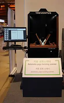 In 2007 the company TREVENTUS presented an automated book scanner with a book opening angle for scanning of 60°. Which is an improvement in the area of conservation of the books during scanning. The company was awarded with the European Union "ICT Grand Prize 2007",[22][23] for its development of the ScanRobot. This technology was also used in a mass digitization project from the Bavarian State Library[24] where 8,900 books from the 16th century were digitized in 18 months using three of these v-shape scanners.