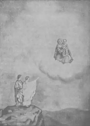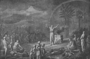 Lehi has a vision of the tree of life.[7] Relating this vision to his children, he expounds on it by teaching about the Messiah, and that they need to be righteous. Nephi prays to the Lord for a similar vision and help understanding his father's vision. In his vision, Nephi sees the vision his father had described, and also given an explanation about its symbolism.[8] Nephi is shown many past and future events, including the life of the Son of God. He also sees the civilizations of his descendants, the voyages of Columbus,[9] the American Revolutionary War,[10] the scattering of his descendants[11] (the American Indians[12][13]), the Book of Mormon, its translation by Joseph Smith,[14] the restoration of God's church,[15] continued revelation in the modern era,[16] and the correction of biblical translation errors.[17] Nephi sees apocalyptic events, but is forbidden to write about them because John the Apostle will write them in the Bible. Finally, Nephi sees the future generations of his descendants, and of his brothers Laman and Lemuel. Whereas his people will have the gospel, they will ultimately be destroyed for wickedness; however the children of his brothers will be raised without a knowledge of the gospel, survive to the modern era, and be taught by the gospel and the restored church.