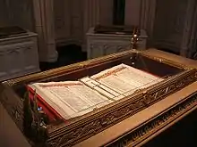 The eight Books of Remembrance (French: Livres du Souvenir) housed in the Memorial Chamber in the Peace Tower of the Canadian Parliament Buildings in Ottawa are illuminated manuscript volumes recording the names of members of the Canadian Forces and Canadian Merchant Navy killed on active service in wartime, and in other conflicts.[1] There are eight separate books, beginning with the first to be commissioned listing the names of the dead from the First World War.[2]
