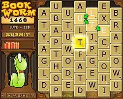 Bookworm is a word-forming puzzle video game by PopCap Games. From a grid of available letters, players connect letters to form words. As words are formed, they are removed from the grid and the remaining letters collapse to fill the available space. Players earn more points by creating longer words or words which use less common letters and earn less for smaller words. In November 2006, PopCap Games released a sequel, Bookworm Adventures. Bookworm was released for the Nintendo DS digital distribution service DSiWare on November 30, 2009.[2] It has also been released on the regular Nintendo DS cartridge.[3]