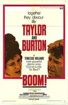 Boom! is a 1968 British drama film directed by Joseph Losey and starring Elizabeth Taylor, Richard Burton and Noël Coward. It was adapted by Tennessee Williams from his own play The Milk Train Doesn't Stop Here Anymore.