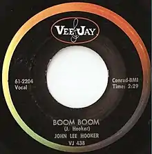 "Boom Boom" is a song written by American blues singer and guitarist John Lee Hooker and recorded in 1961. Although it became a blues standard,[3] music critic Charles Shaar Murray calls it "the greatest pop song he ever wrote".[4] "Boom Boom" was both an American R&B and pop chart success in 1962 and a UK top-twenty hit in 1992.