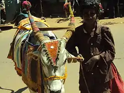 A Boom Boom Ox (Tamil: பூம் பூம் மாடு) is a decorated ox used in Tamil Nadu, India for fortune-telling by Boom Boom Mattukaran tribe. These oxen are decorated with jewellery, bells and bright cloth and are led by fortune tellers to individual houses or places where people gather. The patron usually stands in front of the ox and the fortune teller. The fortune teller asks the ox questions in a sing-song voice about the future of the patron. The Ox is trained to nod yes or no for the questions and from its head nods, the fortune teller tells the fortune of the patron. The term "Boom Boom Ox" is also used an insult in Tamil to denote a yes man or a weak willed person.[1]