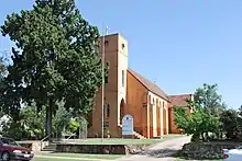 In 1882, the Primitive Methodist Church congregation had grown too large to continue to use the Provisional School.[24] Thomas Hardcastle donated 1 acre (0.40 ha) of land for a church on Old Mount Alford Road near the former Dugandan Bridge.[25] There was a ceremonial cutting of the first sod on Saturday 23 December 1882 by Miss Jessie Hardcastle.[26][27] The church was 22 by 14 feet (6.7 by 4.3 m) and built by George Beverley and T. Austin. It was officially opened on 4 November 1883.[28] In 1892 concerns about flooding led to fundraising to relocate the church to the southern end of High Street in Boonah (now the location of the manse).[29] Eventually that church building became too small for the congregation so a new church was built at 9 Church Street (27.9989°S 152.6828°E) and was officially opened on Sunday 10 November 1907.[30] In 1908 the old church building was relocated to Kalbar. Following the amalgamation of the Methodist Church into the Uniting Church in Australia, a new Uniting Church building was built at 10 Macquarie Street (28.0015°S 152.6881°E). The church building in Church Street was sold to the Salvation Army and was subsequently sold into private ownership.[31][32]