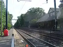 After Upper Montclair station the tracks turn northeast, crossing under Lorraine Avenue, and paralleling Valley Road. The line continues northward paralleling Upper Mountain Avenue through the Upper Montclair district. A short distance later, the tracks enter Mountain Avenue, the next to last station in Montclair. Mountain Avenue has two low platforms, and the nearby station building, which is rented by New Jersey Transit as a private residence. The building was constructed in 1889 by the New York & Greenwood Lake as an irregular shape, similar to Benson Street station on the former Boonton Line alignment east of Montclair.[11] After Mountain Avenue the tracks continue northward through Upper Montclair, passing through Mountainside Park and crossing Mount Hebron Road.[43]
