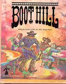 Boot Hill is a western-themed role-playing game designed by Brian Blume, Gary Gygax, and Don Kaye (although Kaye unexpectedly died before the game was published), and first published in 1975. Boot Hill was TSR's third role-playing game, appearing not long after Dungeons & Dragons and Empire of the Petal Throne, and taking its name from "Boot Hill", the popular Wild West term for "cemetery". Boot Hill was marketed to take advantage of America's love of the western genre. The game did feature some new game mechanics, such as the use of percentile dice, but its focus on gunfighting rather than role-playing, as well as the lethal nature of its combat system, limited its appeal. Boot Hill was issued in three editions over 15 years, but it never reached the same level of popularity as D&D and other fantasy-themed role-playing games.
