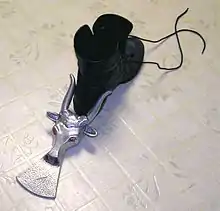 A boot jack, sometimes known as a boot pull, is a small tool that aids in the removal of boots. It consists of a U-shaped mouth that grips the heel of the boot, and a flat area to which weight can be applied with the opposite foot. To operate it, the user places the heel of the boot in the mouth of the jack, stands on the back of the device with the other foot, and pulls his foot free of the front boot. The process is then repeated to remove the other boot.