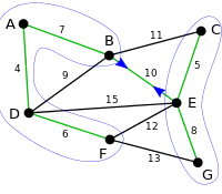 {A,B,C,D,E,F,G} | In the second and final iteration, the minimum weight edge out of each of the two remaining components is added. These happen to be the same edge. One component remains and we are done. The edge BD is not considered because both endpoints are in the same component. |