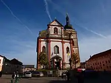 The Baroque Church of Saint Nicolas is a landmark of the town square. It was first mentioned in 1282, rebuilt in the 14th–16th centuries, and after a big fire in 1647 once again rebuilt. It has a late Gothic prismatic tower.[8]