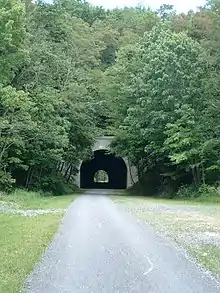 The Borden Tunnel is a 957-foot long, formerly abandoned, railway tunnel located about 2.5 miles (4 km) north of Frostburg, Maryland. The tunnel is lit with a series of motion activated LED lights powered by a solar panel located just north of the tunnel. It is now part of the Great Allegheny Passage rail trail.[1][2]