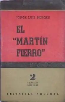 Borges on Martín Fierro concerns Argentinian Jorge Luis Borges's comments on José Hernández's nineteenth-century poem Martín Fierro. Like most of his compatriots, Borges was a great admirer of this work, which he often characterized as the one clearly great work in Argentine literature. Because Martín Fierro has been widely considered (beginning with Leopoldo Lugones's El Payador, 1916) the fountainhead or pinnacle of Argentine literature, Argentina's Don Quixote or Divine Comedy, and because Borges was certainly Argentina's greatest twentieth-century writer, Borges's 1953 book of essays about the poem and its critical and popular reception–El "Martín Fierro" (written with Margarita Guerrero)—gives insight into Borges's identity as an Argentine.