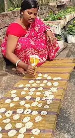 The paste is laid out by hand on a mat in the sunlight. It sticks to the mat while wet but when the bori dries completely it can easily come off. In its simplest form bori takes the conical shape naturally occurring due to the way the paste is laid out.[2]