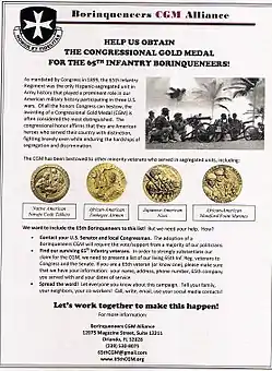Other national organizations supporting the Congressional Gold Medal initiative include the League of United Latin American Citizens (LULAC), Military Order of the Purple Heart (MOPH), American GI Forum (AGIF), and National Puerto Rican Coalition (NPRC).[16] Individuals and organizations around the U.S. are currently advocated for the passage of both 65th Infantry CGM bills. They are urged their federal elected officials to join on as co-sponsors of HR 1726 in the House, and S 1174 in the Senate.[17] The Borinqueneers Congressional Gold Medal Alliance,[18] officially sponsored by the You Are Strong! Center on Veterans Health and Human Services, was the leading organization dedicated to the effort.