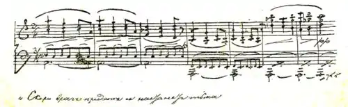 Mussorgsky worked rapidly, composing first the vocal score in about nine months (finished 18 July 1869), and completed the full score five months later (15 December 1869), at the same time working as a civil servant.[12][14] In 1870, he submitted the libretto to the state censor for examination, and the score to the literary and music committees of the Imperial Theatres.[15] However, the opera was rejected (10 February 1871) by a vote of 6 to 1, ostensibly for its lack of an important female role.[16] Lyudmila Shestakova recalled the reply made by conductor Eduard Nápravník and stage manager Gennadiy Kondratyev of the Mariinsky Theatre in response to her question of whether Boris had been accepted for production:[17]
