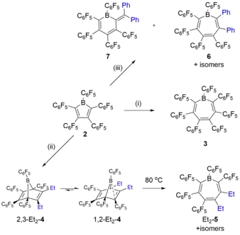 The parent unsubstituted compound with the chemical formula C4H4BH has yet to be isolated outside a coordination sphere of transition metals.[2] Substituted derivatives, which have been synthesized, can have various substituents at the 4 carbons and boron.[3] The high electron deficiency leads to various reactivities such as metal free hydrogen activation and rearrangements upon cycloaddition which are unobserved in other structural analogues like pyrrole or furan.