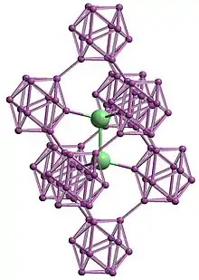 Boron arsenide also occurs as subarsenides, including the icosahedral boride B12As2. It belongs to R3m space group with a rhombohedral structure based on clusters of boron atoms and two-atom As–As chains. It is a wide-bandgap semiconductor (3.47 eV) with the extraordinary ability to "self-heal" radiation damage.[13] This form can be grown on substrates such as silicon carbide.[14] Another use for solar cell fabrication[8][15] was proposed, but it is not currently used for this purpose.