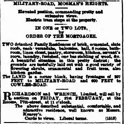 In 1891 John's wife Lucy died and three years later in 1894 John also died.[10]: 30 James and Ellen continued to live at Boronia for two more years. However, in 1896 both houses were put on the market. The advertisement for their sale is shown on the right. Boronia was bought by George Willis Godwin and the Godwin family lived there for the next 50 years.