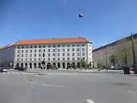 Kay Fisker's Neoclassical Hornbækhus from 1923 is one of the finest examples of the large residential blocks that were built in Copenhagen in the 1920s. It is 200 metres long and 80 metres wide and contains 290 apartments.[4] The building occupies the block bounded by Borups Allé (No. 5–23), Hornbækgade (No. 2-10), Skotterupgade No. 13–19) and Ågade (No. 116–134). It surrounds a green space designed by Gudmund Nyeland Brandt.[5]