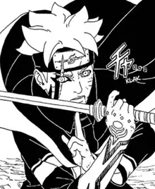 When Isshiki Otsutsuki invades the village, Boruto uses the Karma to send him to another dimension where he, Kawaki, Naruto and Sasuke manage to defeat him. Shortly afterward, Momoshiki possesses Boruto again and tries to kill Sasuke, managing to destroy his Rinnegan. The wounded Sasuke and Kawaki manage to fight Momoshiki until the young ninja recovers his own self. Still conflicted with the Otsutsuki taking part of their bodies with the Karma, Boruto and Kawaki decide to investigate the Kara agent Code to eliminate their curse. Kawaki unleashes his own Karma to kill Boruto while being controlled by Momoshiki. However, Momoshiki merges with Boruto so that he will not be erased permanently. He later accepts a mission to help keep an eye on Eida and Daemon with Kawaki, Sarada, Mitsuki, Shikadi, Inojin, and ChoCho. When he finds out that Kawaki had sealed away Naruto and Hinata, he goes to confront Kawaki. He saves Sarada from Kawaki's attack giving him his scar across his eye. Later Kawaki has Eida do ominipotence which alters the memories of people who are not Otsutsuki and makes them think that Kawaki is the Hokage's son while Boruto is the outsider.