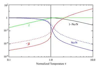 It can be seen that each of these parameters become linear in τα in the limit of low temperature and, except for the chemical potential, linear in 1/τα in the limit of high temperature. As the number of particles increases, the condensed and excited fractions tend towards a discontinuity at the critical temperature.