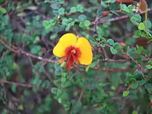 Bossiaea cordigera , commonly known as wiry bossiaea,[2] is a species of flowering plant in the family Fabaceae and is endemic to southern Australia. It is a straggling shrub with wiry branches, egg-shaped to more or less heart-shaped leaves and yellow and red flowers.