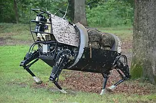 BigDog was a quadrupedal robot created in 2005 by Boston Dynamics, in conjunction with Foster-Miller, the Jet Propulsion Laboratory, and the Harvard University Concord Field Station. It was funded by DARPA in the hopes that it would be able to serve as a robotic pack mule to accompany soldiers in terrain too rough for vehicles, but the project was shelved after BigDog was deemed too loud to be used in combat.[18][19] Instead of wheels, BigDog used four legs for movement, allowing it to move across surfaces that would defeat wheels. Called "the world's most ambitious legged robot", it was designed to carry 340 pounds (150 kg) alongside a soldier at 4 miles per hour (6.4 km/h; 1.8 m/s), traversing rough terrain at inclines up to 35 degrees.