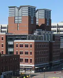 The market occupies most of the ground floor of a mixed use building constructed as part of the Big Dig highway and tunnel project. The building, on a site known as Parcel 7,[11] also includes ventilation towers for the underground highway, a portion of the Haymarket Station of the MBTA Green and Orange lines, the Haymarket Center Garage,[12] and office space occupied by the Massachusetts Registry of Motor Vehicles.[13] The building's architect was Arrowstreet.[14]