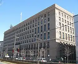 The Administration Building faces Huntington Avenue and is faced with grey brick. It is the most distinctive element of the complex.