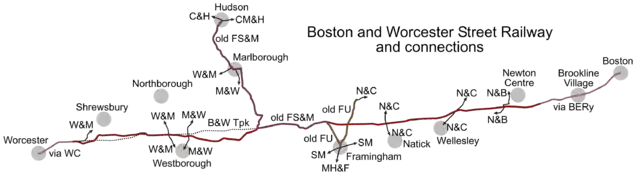- The Framingham, Southborough and Marlborough Street Railway and its subsidiary Marlborough and Framingham Street Railway operated a line between Hudson and Framingham Center via Marlborough and Southborough. The B&W used this line between Fayville and Framingham Center.