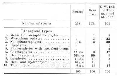From Ostenfeld's "The land-vegetation of the Færöes", Table comparing Raunkiær plant life-form spectra of the floras of the Faroe Islands, Denmark proper and the Danish West Indies.