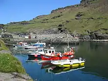 Boscastle (Cornish: Kastel Boterel)[1] is a village and fishing port on the north coast of Cornwall, England, in the civil parish of Forrabury and Minster (where the 2011 Census population was included) . It is 14 miles (23 km) south of Bude and 5 miles (8 km) northeast of Tintagel.[2] The harbour is a natural inlet protected by two stone harbour walls built in 1584 by Sir Richard Grenville and is the only significant harbour for 20 miles (32 km) along the coast. The village extends up the valleys of the River Valency and River Jordan. Heavy rainfall on 16 August 2004 caused extensive damage to the village.