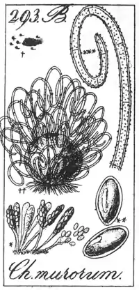 Chaetomium murorum was first discovered by August Carl Joseph Corda in 1837 when he sampled the fungus from a wall in Prague. The Latin name "murorum" means "wall".[2] In 2016 X. W. Wang et al. re-examined a set of cultures of Chaetomium-like fungi using phylogenetic analysis of the DNA directed RNA polymerase II subunit gene sequence. Chaetomium murorum, together with the genus Emilmuelleria, were then transferred to the genus Botryotrichum as the phylogenetic analysis confirmed that they clustered in the Botryotrichum clade. The current name for C. murorum is B. murorum.[3]