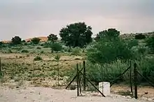 thence up the course of the Limpopo River to the point where the Marique [Marico] River falls into it. Thence up the course of the Marique River to "Derde Poort," where it passes through a low range of hills, called Sikwane, a beacon (No. 10) being erected on the spur of said range near to, and westward of, the banks of the river; thence, in a straight line, through this beacon to a beacon (No. 9), erected on the top of the same range, about 1,700 yards [1,600 m] distant from beacon No. 10; thence in a straight line to a beacon (No. 8) erected on the highest point of an isolated hill called Dikgagong [Dikgogone], or "Wildebeest Kop," situated south-eastward of and about 3+1⁄3 miles [5.4 km] distant from a high hill, called Moripe [Modipe]; thence in a straight line to a beacon (No. 7) erected on the summit of an isolated hill or "koppie" forming the eastern extremity of the range of hills called Moshweu, situated to the northward of and about two miles [3 km] distant from a large isolated hill called Chukudu-Chochwa [Tshukudutshojwe]; thence, in a straight line, to a beacon (No. 6) erected on the summit of a hill forming part of the same range, Moshweu; thence, in a straight line, to a beacon (No. 5) erected on the summit of a pointed hill in the same range; thence, in a straight line, to a beacon (No. 4) erected on the summit of the western extremity of the same range; thence, in a straight line, to a beacon (No. 3) erected on the summit of the northern extremity of a low, bushy hill, or "koppie," near to and eastward of the Notwane River; thence, in a straight line, to the junction of the stream called Metsi-Mashwane [Metsemaswaane] with the Notwane River (No. 2); thence up the course of the Notwane River to Sengoma, being the Poort where the river passes through the Dwarsberg Range ; thence, as described in the Award given by Lieutenant-Governor Keate, dated 17 October 1871, by Pitlanganyane [Pytlaganyane] (narrow place), Deboaganka or Schaapkuil, Sibatoul [Sebataole] (bare place), and Maclase [Matlhase] to Ramatlabama, a pool on a spruit north of the Molopo River.[3]