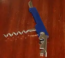 The 'waiter's friend' or 'wine key' consists of a flat housing (often plastic covered) similar to a Swiss army knife with a corkscrew and lever (which doubles as crown cork opener) with either a knife or auto-foiler to remove the foil top of wine bottles and then the cork. Designed to be screwed in to within 1 full rotation before the end of the screw (more will pierce the bottom of the cork and result in extra flotsam on the surface of the wine) before levering out the cork.