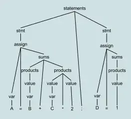 ![]() Typical parse tree for A = B + C*2; D = 1 |