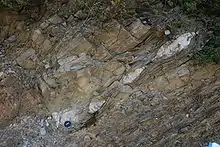 Boudinage is a geological term for structures formed by extension, where a rigid tabular body such as hornfels, is stretched and deformed amidst less competent surroundings.[1] The competent bed begins to break up, forming sausage-shaped boudins. Boudinage is common and can occur at any scale, from microscopic to lithospheric, and can be found in all terranes.[2] In lithospheric-scale tectonics, boudinage of strong layers can signify large-scale creep transfer of rock matter.[2] The study of boudinage can also help provide insight into the forces involved in tectonic deformation of rocks and their strength.[2]