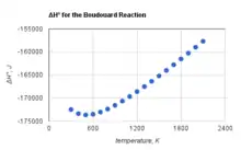 The Boudouard reaction to form carbon dioxide and carbon is exothermic at all temperatures. However, the standard enthalpy of the Boudouard reaction becomes less negative with increasing temperature,[2] as shown to the side.