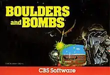 Boulders and Bombs is an Atari 8-bit family video game published on cartridge by CBS Software in 1983.[2] It was written by written by Keith Dreyer and Torre Meeder who previously developed the Berzerk-clone K-Razy Shoot-Out. In Boulders and Bombs, the player must dig tunnels so three people can cross from one side of the screen to the other. Bird-like creatures, flying in the upper portion of the screen, launch projectiles into the dirt to thwart the player. While there isn't a separate multiplayer mode, joysticks plugged into each of the remaining 1-3 ports can each control one of the birds. The game generally received poor reviews.