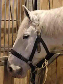 The Boulonnais today stands from 14.3 to 16.3 hands (59 to 67 inches, 150 to 170 cm) or more.[2] It has a short, elegant head with a broad forehead and a short, muscular neck. Members of the breed have full chests, rounded rib cages and sloping shoulders. The legs are fairly short but robust and strong.[1] Unlike other draft breeds such as the Shire or Clydesdale, it has no heavy feathering on its lower legs.[3] The breed is generally branded with a small anchor mark on the left side of the neck.[1] Due mostly to the many additions of Oriental blood, the Boulonnais has an elegant appearance that is not often seen in heavy draft breeds and it has been called "Europe's noblest draft horse".[4] The fineness of the skin and delicate appearance of the veins has allowed the horse to be described as looking "like polished marble",[4] leading to its "White Marble Horse" nickname.