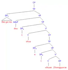 If a pronoun has a quantified expression as antecedent, the pronoun must be c-commanded by this antecedent.[3][4] An antecedent c-commands a pronoun if, when observing the structure of the sentence, a sister of the antecedent dominates the pronoun.[5]