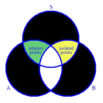 Conceptual Venn diagram showing the relationships among different points of a subset of = set of limit points of set of boundary points of area shaded green = set of interior points of area shaded yellow = set of isolated points of areas shaded black = empty sets. Every point of is either an interior point or a boundary point. Also, every point of is either an accumulation point or an isolated point. Likewise, every boundary point of is either an accumulation point or an isolated point. Isolated points are always boundary points.