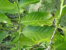 Young leaves are green in color and mature leaves are generally larger than Typica leaves. Plagiotropic (secondary) branches grow at a slight angle, roughly 60° from the main (orthotropic) stem. Bourbon cherries are generally more round than Typica cherries. Bourbon accessions from Yemen tend to have a single main stem (monocauly) whereas accessions from Ethiopia tend to form multiple stems.