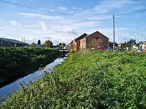 At the north end of Church Lane, another culvert takes it under the gardens of the vicarage. This culvert and the South Street culvert are quite old, since they appear on the 1888 Ordnance Survey map.[8] When the river resurfaces, if turns to the south, running behind the church building and then to the east along the back of gardens belonging to houses on Coggles Causeway. A lengthy culvert carries it under the Abbey Lawn complex and Victoria Place.[5] This culvert is more recent, as it was built in the 1960s when the recreation ground became the Abbey Lawn sports complex. Before the culvert was built, the railway line to Sleaford crossed the river near to where the culvert starts.[9] It passes under Queen's Bridge, and then runs parallel to Eastgate. Half way along Eastgate, the channel becomes much wider, where it formed the terminal basin for the Bourne Eau when it was navigable. The Roman Car Dyke, now reused as a drainage channel, originally ran though the town, passing along the west side of Queen's Bridge,[8] but a modern channel joins the southern section to the basin,[5] on the north bank of which is the Anchor Inn, a small grade II listed public house dating from the 18th century.[10] The A151 Cherry Holt Road crosses the waterway at May's Sluice, and then it enters South Fen,[5] where it is joined by another channel linking to the Car Dyke on its north bank. Below the junction its flow is supplemented by the treated outfall from Bourne sewage treatment works. The river is embanked on both sides, and there are low level catchwater drains running parallel to the banks. A bridge carried the railway to Spalding over the river.[1]