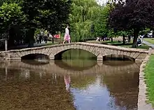 Bourton-on-the-Water's high street is flanked by long wide greens and the River Windrush that runs through them. The river is crossed by five low, arched stone bridges. They were built between 1654 and 1953, leading to the nickname of "Venice of the Cotswolds".[3]