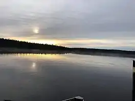 - the southern part of a length of 7.6 kilometres (4.7 mi) in the form of a double hook (one North hook is the "Bay of Wisdom" and the other hook, the bay of the mouth of the lake ), receiving the discharge from Finbar Lake.