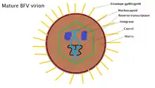 Bovine foamy virus is an enveloped, spherical virus. The virus particles are approximately 80-100 nm in diameter and contain single-strand, positive-sense RNA: ss(+)RNA. 20% of released virions contain double stranded DNA as a product of late stage reverse transcription. The outer membrane of the virus is covered with a variety of glycoproteins which allow it to interact with its surroundings. Just beyond the envelope is a buffer between the capsid and envelope, known as the protein matrix. The matrix is responsible for maintaining membrane shape as well as participating in the budding process. Inside the matrix lies the capsid, a protein shell that contains viral integrase, reverse-transcriptase and the nucleocapsid, inside of which lives the viruses' genetic material.[7] Due to the viruses' tendency to bud into the endoplasmic reticulum, the virions tend to display immature protein characteristics around the core as well as unique glycoptorien spikes on the surface of the membrane. BFV particles also possess electron-lucent membranes which are easily crossed by electrons.[1]