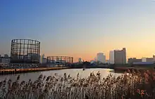 ![]() Bow Creek (tidal) (far left) meets the Limehouse Cut (canal, right), at Bow Locks on the Lee Navigation (centre); with a view of London's Docklands | |